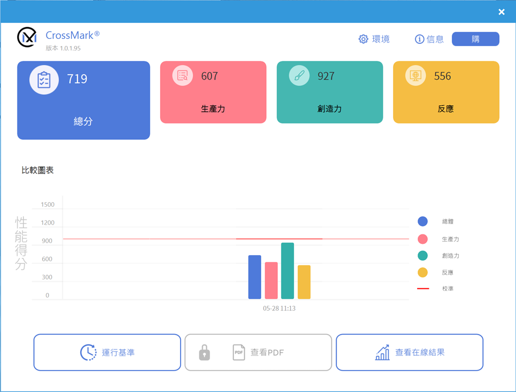 透過 CrossMark 測試表現總分為 719 分,生產力項目 607、創造力 927、反應 556,符合這款處理器的水準。