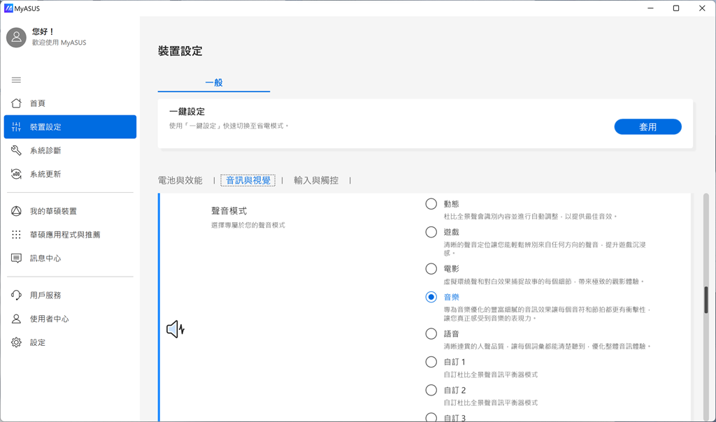 聲音模式同樣可以個人化調整,平常時可以直接套用動態模式,讓杜比全景聲依照當下播放的內容自己提供最佳音效,但如果是使用筆電玩遊戲、看電影、聽音樂的話就可以切換不同模式,讓聲音更符合當下情境。
