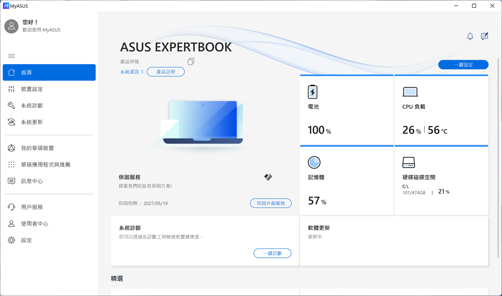 一打開 MyASUS 在首頁就可以看到當前的電池狀態,CPU 負載狀況和記憶體、硬碟空間使用率,如果有系統更新也會提醒。