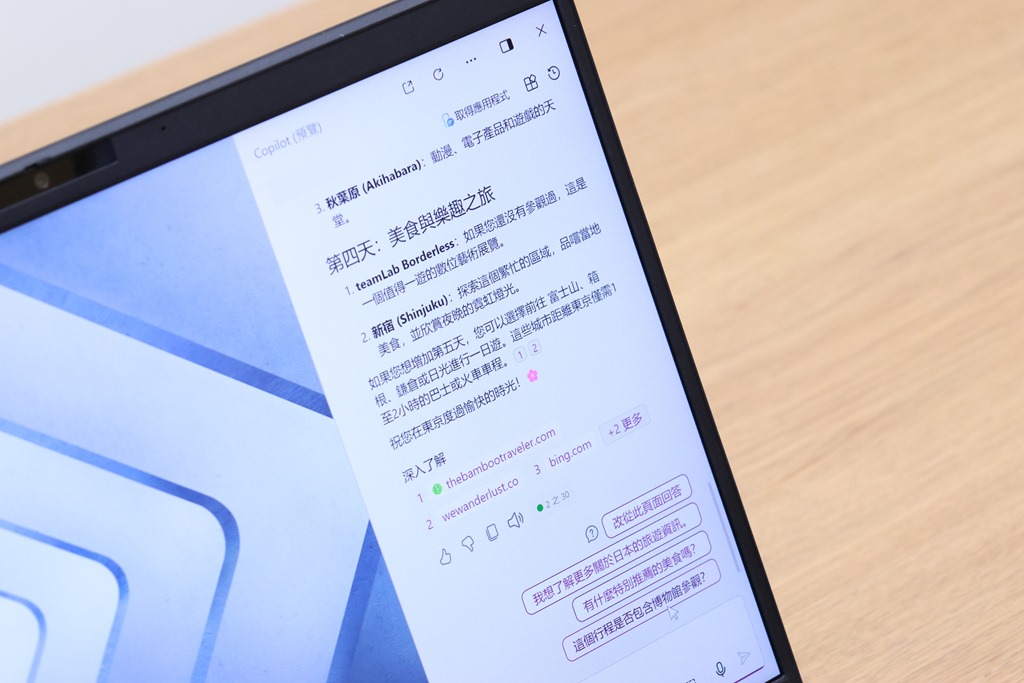 既然搭載了 Copilot 按鍵,當然我們就要請 AI 來協助提高工作效率囉!舉例來說,如果要為公司老闆規劃出差行程,不知道在工作之餘可以帶老闆到哪裡觀光的話,就可以請 Copilot 協助規劃行程。