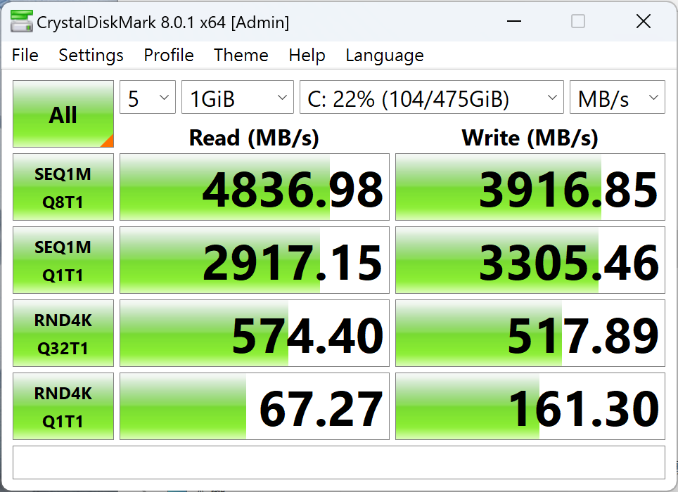 CrystalDiskMark 測試讀寫速度,以商用型筆電來說這樣的讀寫速度算是很夠用了。