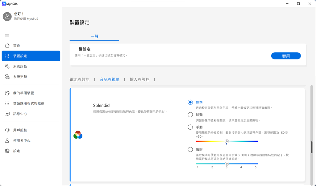 前面提到在 MyASUS 裡有畫面顯示最佳化的設定功能,可以從音訊與視覺選項裡調整畫面是標準色彩、鮮豔色彩,或是依照自己個人喜好調整色溫和護眼效果。