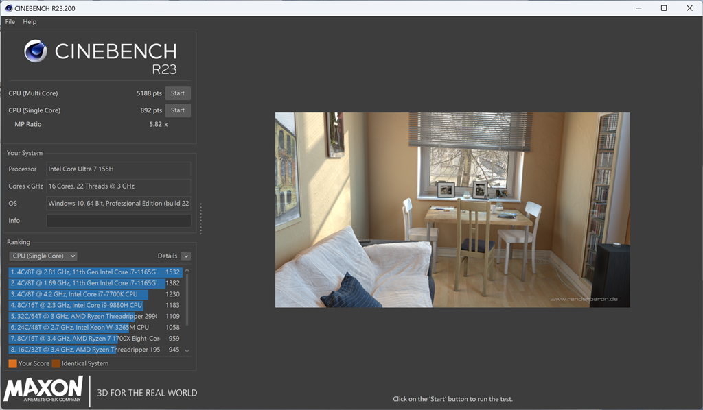 Cinebench R23 測試 CPU 多核成績為 5188 分、單核成績為 892 分。