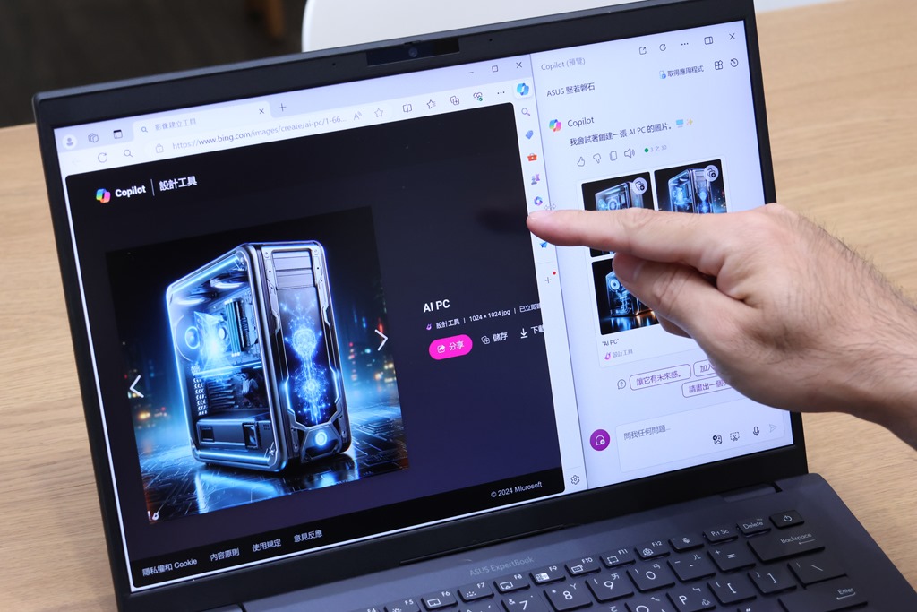 Copilot 不只能生成文字,還能以文字生成圖片,例如製作簡報需要一張封面照片或底圖,請 Copilot 生成一下就可以了,像我們請他畫一張 AI PC 照片,就給了我們一張充滿 AI 感的照片,真的是很聰明。