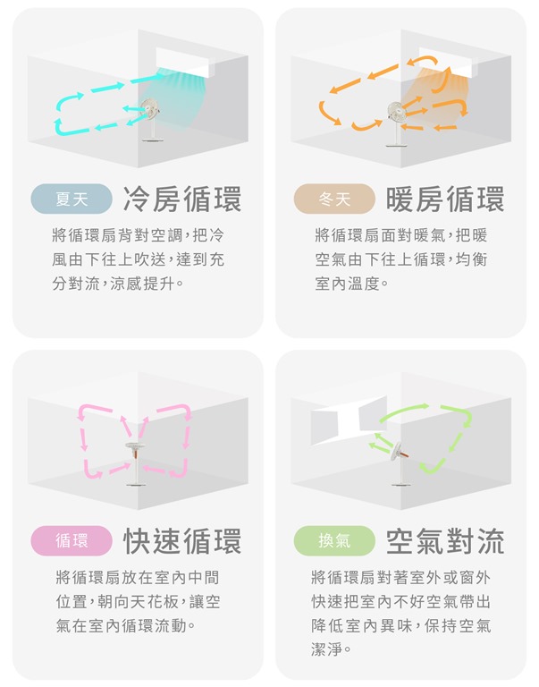 夏季降溫:將循環扇背對冷氣,讓冷風對流,有效降溫。