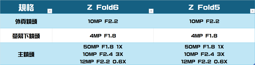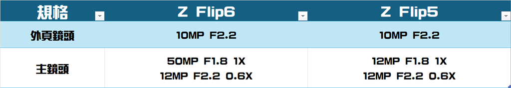 相機規格部分,Z Fold6 與前一代鏡頭規格完全一樣,這部分應該是想要達成輕薄所作的妥協,而 Z Flip6 部分就有調整了,提升到 5000 萬像素 F1.8 主鏡頭,超廣角鏡頭則是維持 0.6X 1200 萬像素 F2.2 鏡頭。
