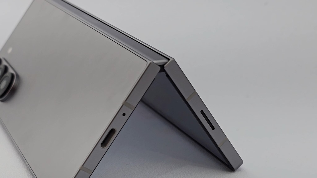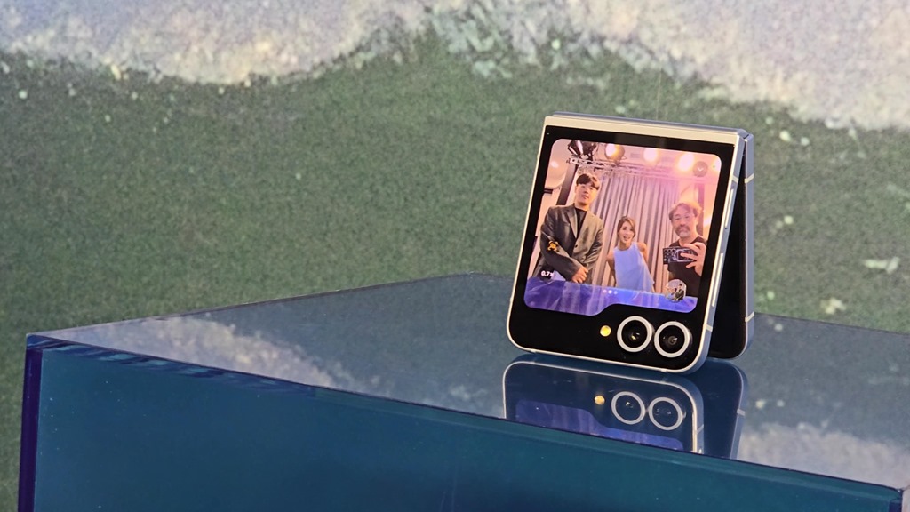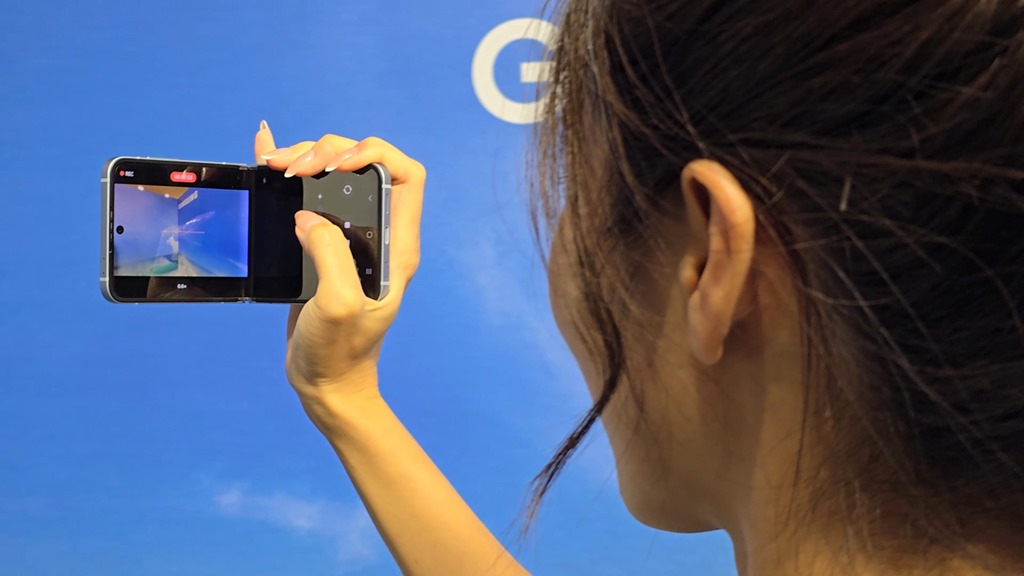 Z Flip6 這次還加入了 V8 攝影功能,也就是手持攝影,以摺疊 90 度方式,一邊進行螢幕預覽、另一邊則是操作介面,拍攝可以更穩定也更為方便。
