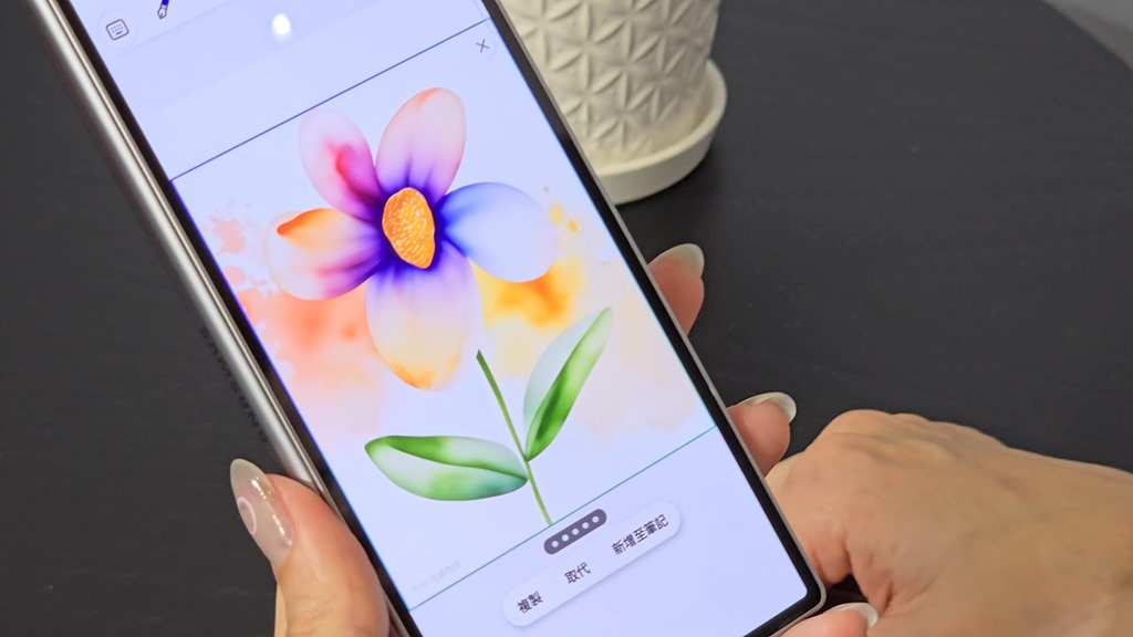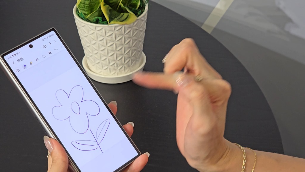 首先介紹的是新增的繪圖助理功能,這對於繪畫技巧不佳的使用者來說是一大福音。無論是在 Samsung Notes 還是相片編輯中,使用者只需隨手塗鴉,透過 Galaxy AI 的運算,便可將草稿轉化為精美的畫作。此外,使用者還能在相片或圖片上塗鴉,例如在衣服上畫顆星星,AI 會將其變成時尚配件。