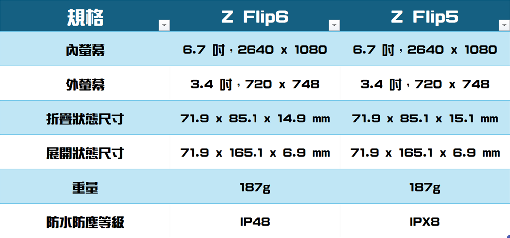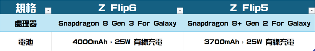 而 Z Flip6 部分,外觀規格與 Z Flip5 完全一樣,連重量部分都是 187g,難道完全沒有進展嗎?因為 Z Flip6 在電池電量提升不少,鏡頭部分也有提升,所以能維持原本重量,就表示整體輕量化也算是有成果。
