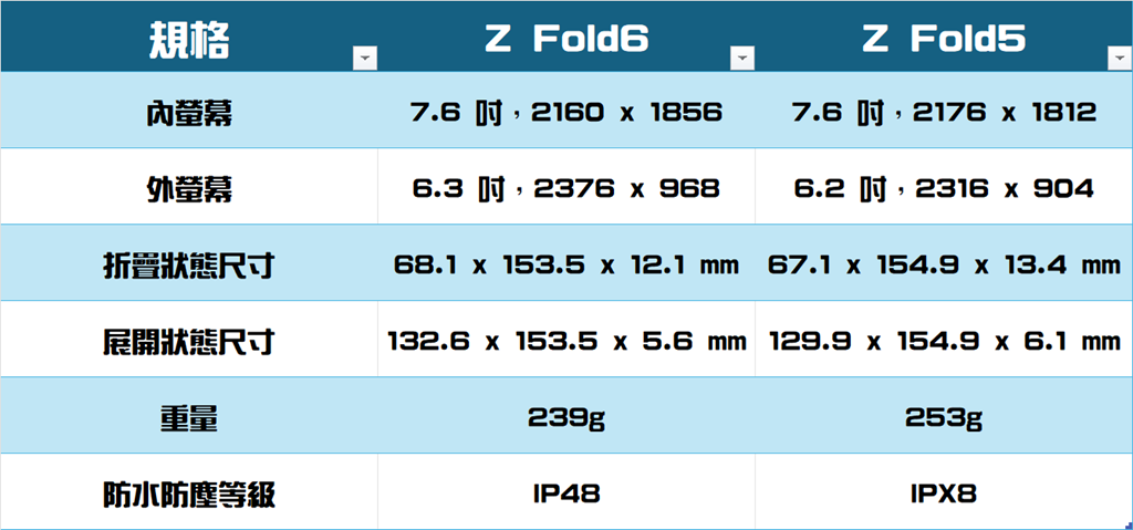 Z Fold6 這次其實變寬、變短也變薄了,在摺疊狀態下寬度為 68.1mm,較上一代寬 1mm;展開後寬度為 132.6mm,較上一代寬 2.7mm。