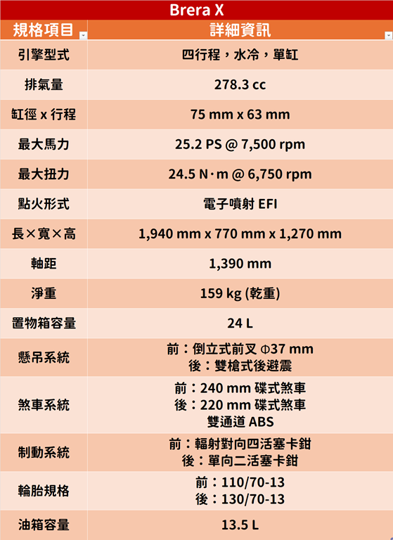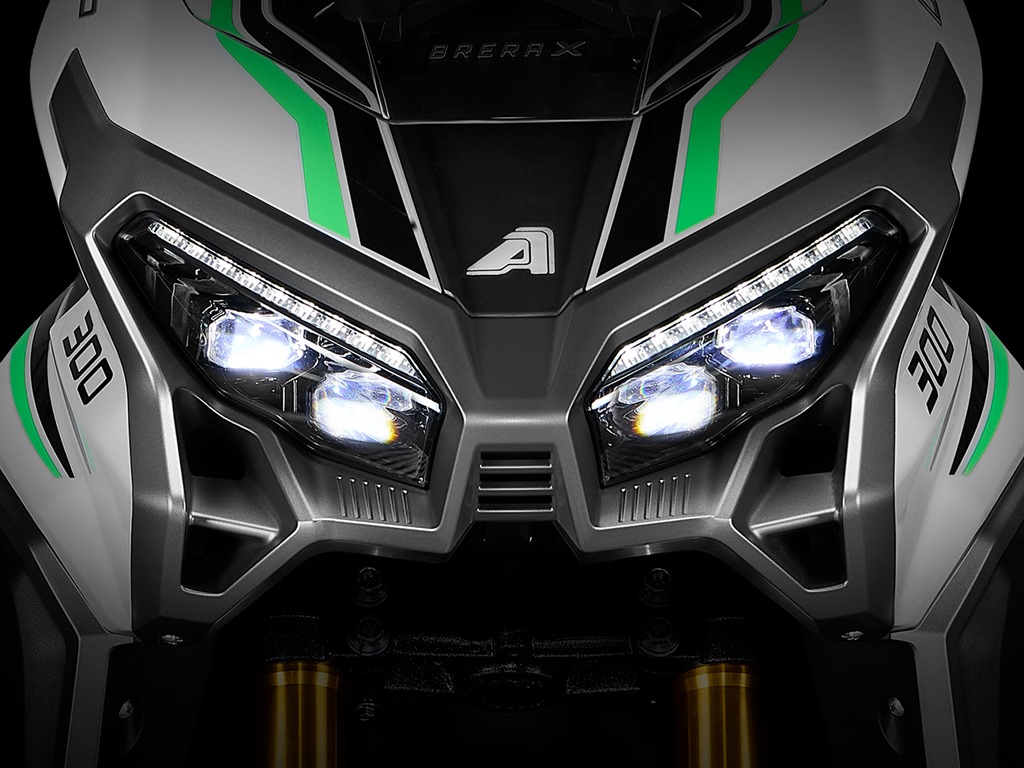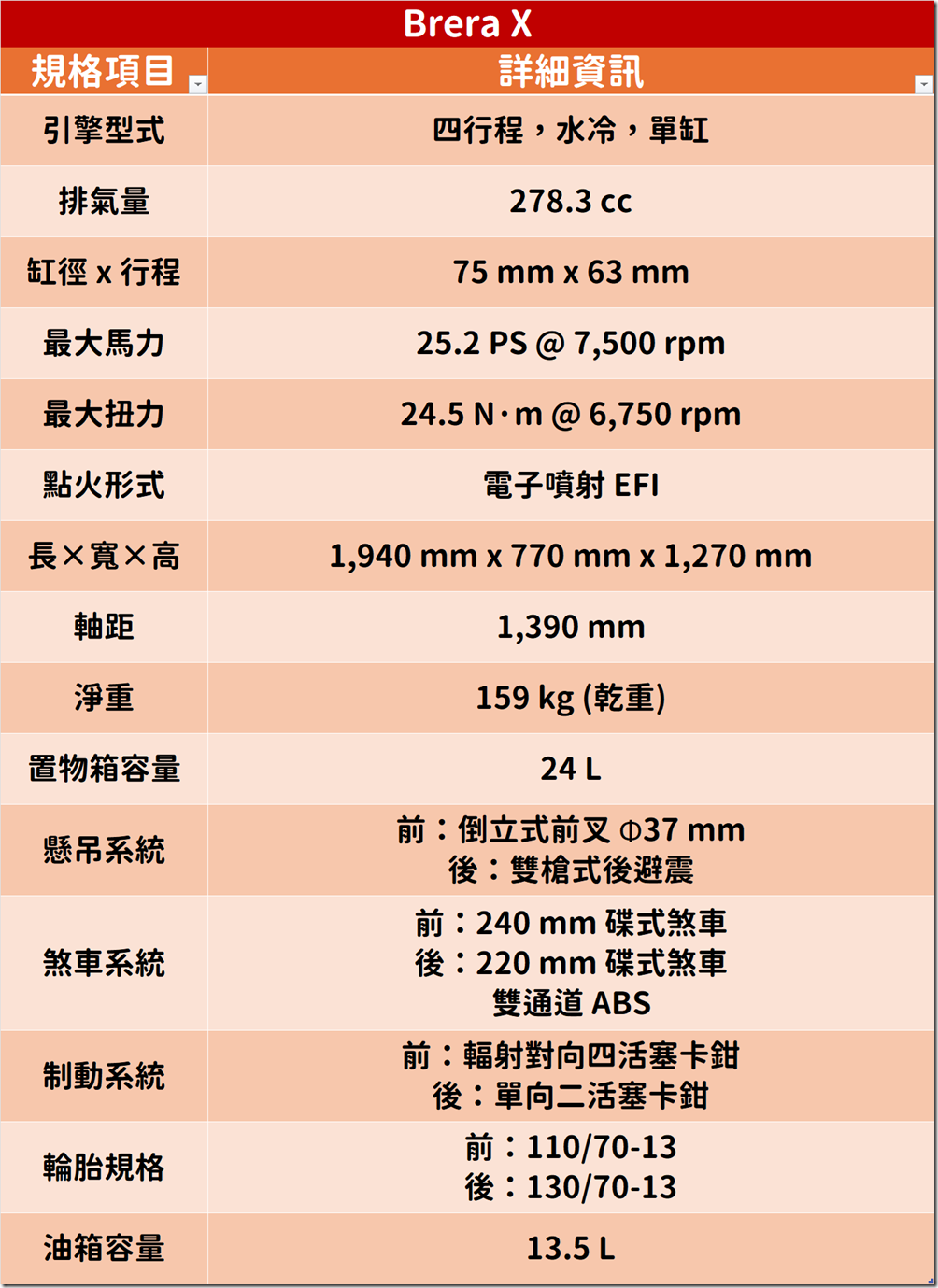 外型部分,Brera X 的設計充滿幾何塊狀及銳利線條,三段式可調風鏡、LED 照明燈具、五吋 LCD 液晶儀表,以及 Keyless 免鑰匙系統,提供使用者極大的便利與安全保障。車身輕巧、軸距短、油箱大,這些設計特點使 Brera X 在 ADV 同級車型中相當具有競爭力。