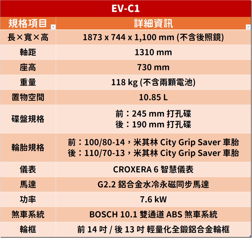 EV-C1 的外觀設計同樣前衛,配有 LED 燈具、高等級頭燈及智慧儀表,內建多項實用功能,如導航、速限提醒等。此款車型有「極光白」和「暗夜黑」兩種顏色可選,搭配多種購車優惠方案,讓消費者有更多元選擇。