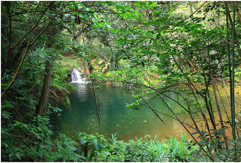 ▲步道沿途可見翠綠美麗的三連潭,其實在一百多年前原住民及客家人會互相爭奪土地,後來泰雅公主與客家拓墾者聯姻,一起努力在苗栗大湖開墾生活,也讓很多美景地景地貌得以保存,另一條穿龍古圳雅悠圳,就是當時聯姻所命名。