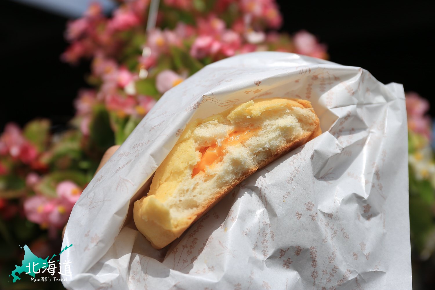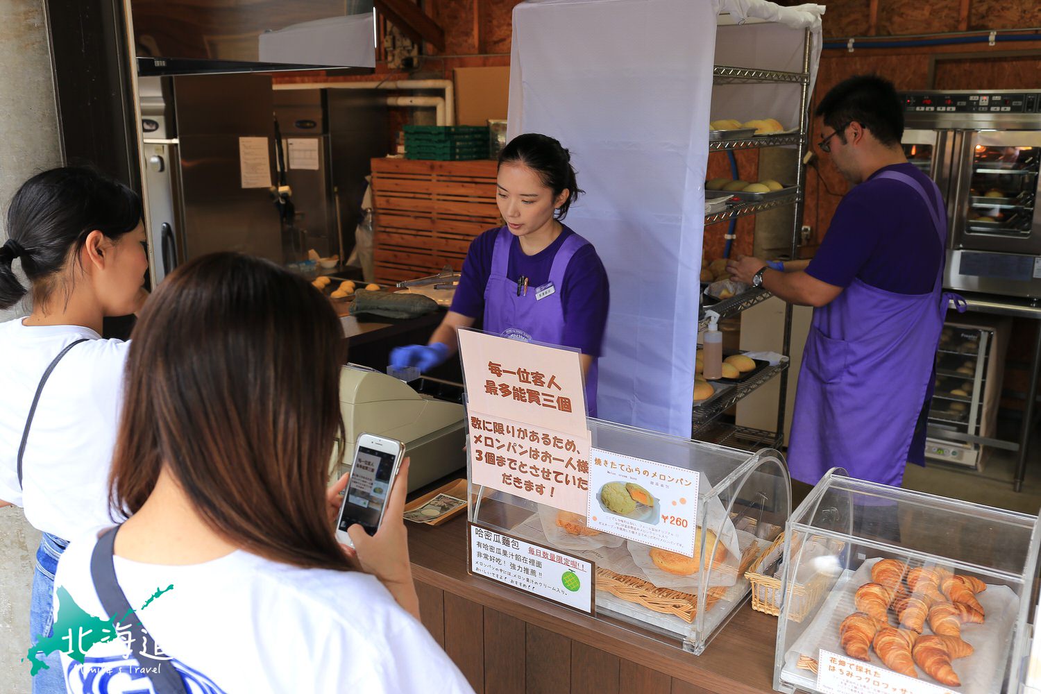 除了薰衣草冰淇淋,這攤賣著哈密瓜波蘿麵包的小店也是擠滿排隊人潮,還寫著每人限購三個,就能知道多搶手哩!買一個來試試果真美味,香甜無比的哈密瓜內餡超級好吃,這可是北海道限定的好東西,別放過它,一定要吃