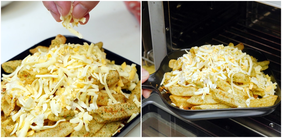 ▼另外還可以發揮創意來個多元吃法,我們將海苔口味多多魚脆條鋪上厚厚一層乳酪絲,放進氣炸鍋氣炸個幾分鐘,等到乳酪絲融化就可以出爐囉!