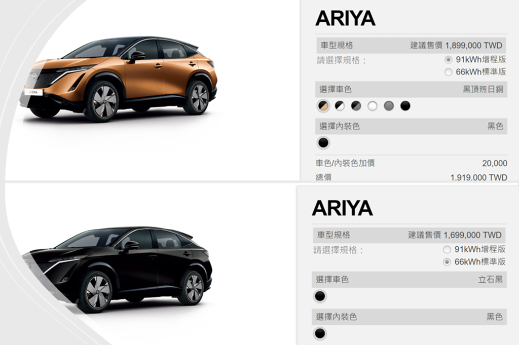 最後,Nissan Ariya 台灣的預售價格分別為標準版 169.9 萬、增程版 189.9 萬。兩種版本皆搭載三元鋰電池,容量分別為 66kWh(可用容量 63kWh)、91kWh(可用容量87kWh),續航里程則為 423 公里以及 548 公里並採用 CCS1 DC 直流快充規格。先不說是否合理或值得,據傳今年配額僅 200 部,看來毫無疑問又將是品牌純電吉祥物了!