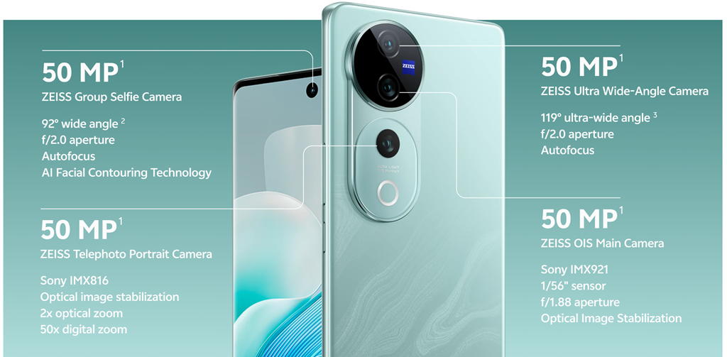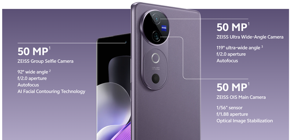 鏡頭配置上,V40 為雙主鏡頭設計,分別為 5000 萬像素 IMX921 感光元件、光圈大小為F1.88 主鏡頭,與 5000 萬像素、 光圈大小為 F2.0 超廣角鏡頭。V40 Pro 則為三主鏡頭設計,主鏡頭與超廣角與 V40 相同,另外多了一顆採用 5000 萬像素 IMX816 感光元件、光圈大小為 F1.85 的 2 倍人像望遠,鏡頭部分都與蔡司有密切合作。