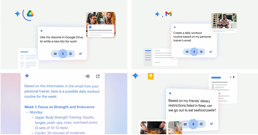 這次重頭戲當然還是在以 AI 技術為核心的 Gemini,它將使用者熟悉的 Google 應用,如行事曆、Gmail 和 Chrome 等整合到 Gemini 平台上,簡單來說,Gemini 就像是一個超強大腦,能把你手機裡的 Google 應用整合在一起,讓你用一個平台就能處理所有事情。