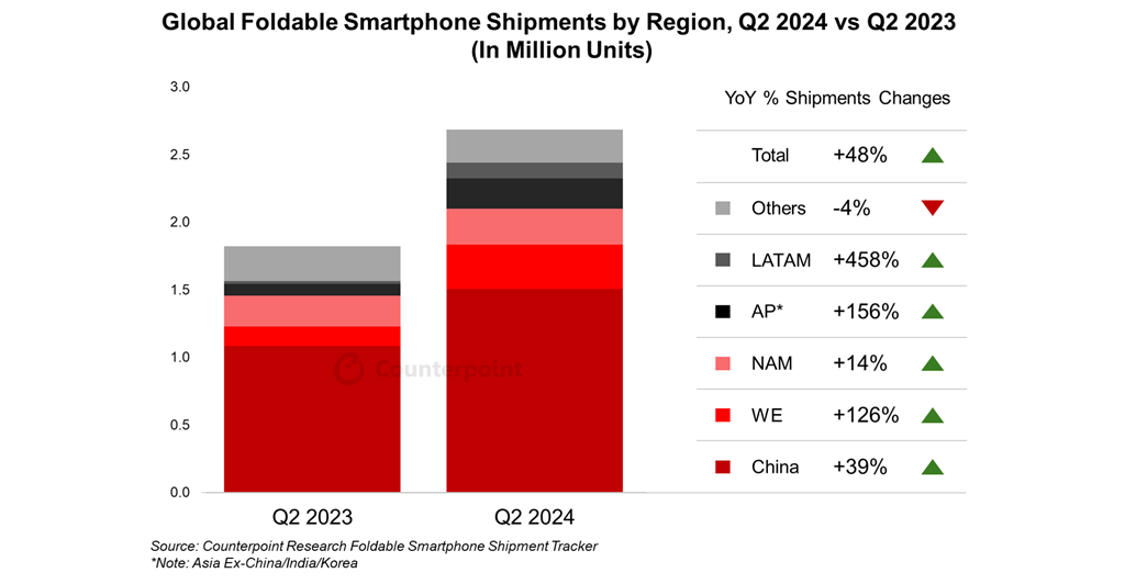 根據最新 Counterpoint Research 報告指出,2024 年第二季全球摺疊手機市場出貨量年增長 48%,中國市場依然是帶動整體市場的主要來源,超過全球銷售量 50%。除了中國的成長外,西歐、亞太與拉丁美洲的出貨量成長也相當驚人。