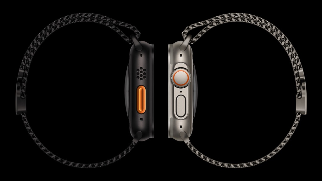 Apple Watch Ultra 2 的全新黑色鈦金屬外觀經過噴砂處理,並塗有類鑽碳膜,具備耐用抗刮的特性。搭配黑色鈦金屬米蘭式錶環,這款錶環輕盈且具防銹蝕特性,靈感源自潛水員網袋,無論在水下運動還是日常穿搭中,都能保持舒適與風格並重。
