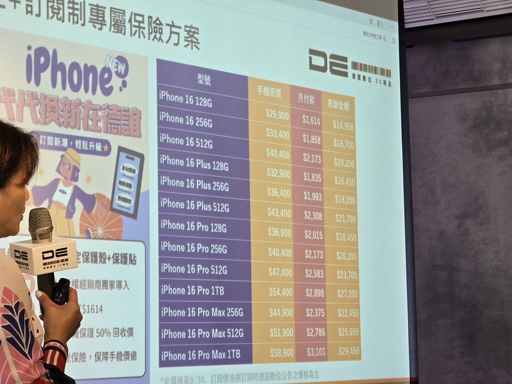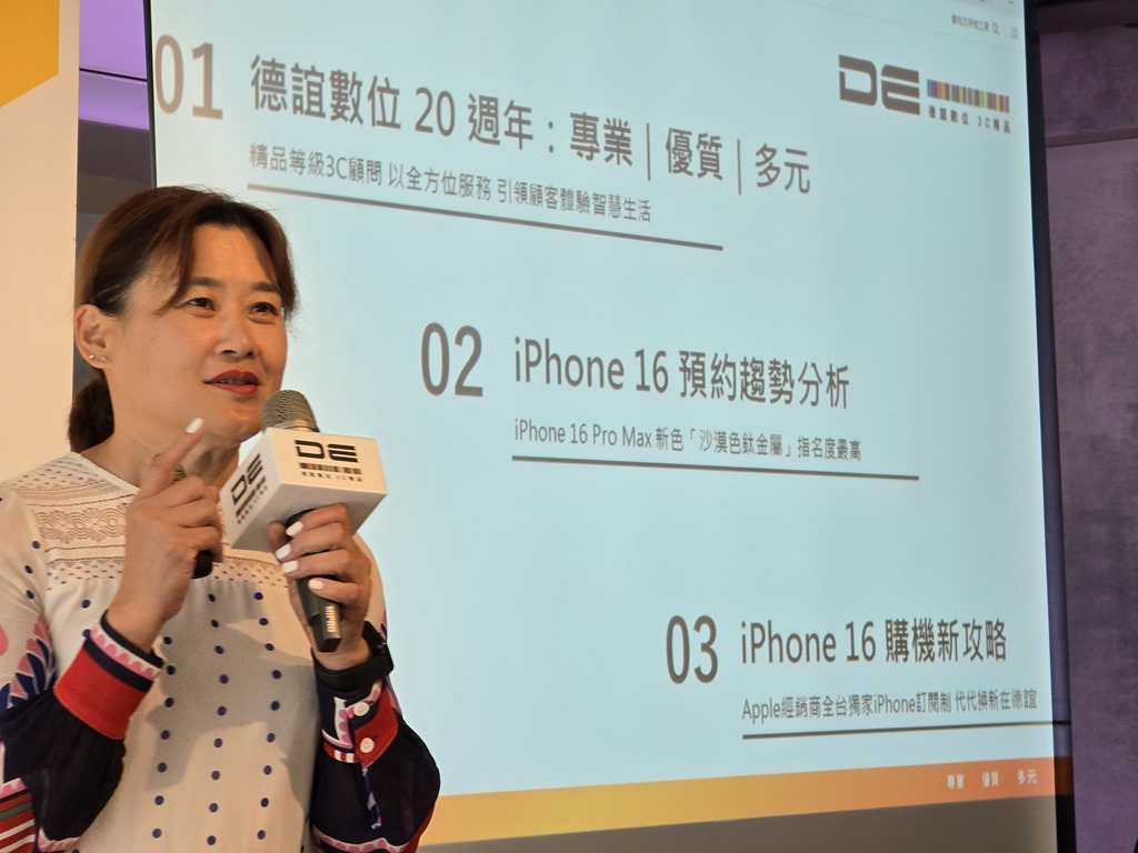 德誼數位總經理鄧美慧表示,今年適逢公司成立 20 週年,德誼持續以提升消費者的購物體驗為目標,推出全台獨家的 iPhone 訂閱制,搭配專屬維修保險,讓消費者以更優惠的價格,無壓力地代代換新機。購買 iPhone 16 系列的消費者還能享受多項優惠,讓不同需求的客群都能找到適合的方案。