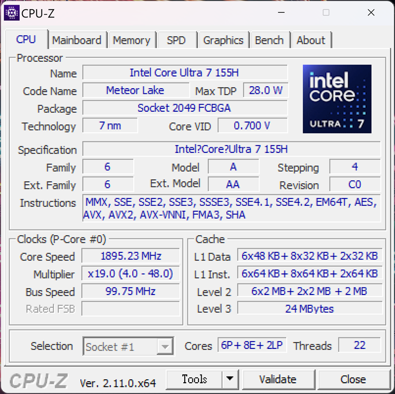 從 CPU-Z 裡查看我們測試的機型,搭載 Intel® Core™ Ultra 7 155H 處禮器。
