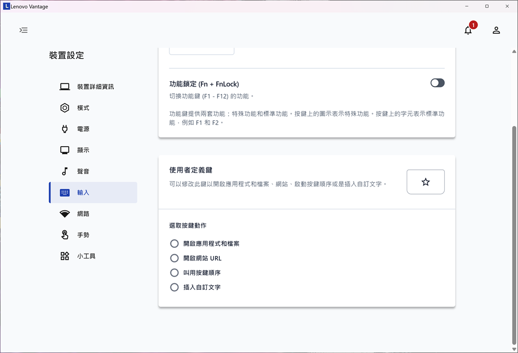 自定義按鍵可以從 Lenovo Vantage 設定指定功能,看是要快速開啟某個應用程式,或是快速插入指定文字都可以。