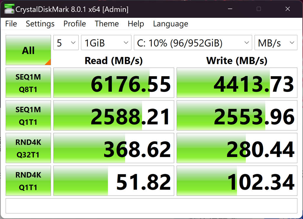 搭配上 32GB DDR5 記憶體、1TB PCIe SSD Gen 4 M.2 儲存空間,透過各式跑分轉體測試結果,效能表現都還滿不錯的。