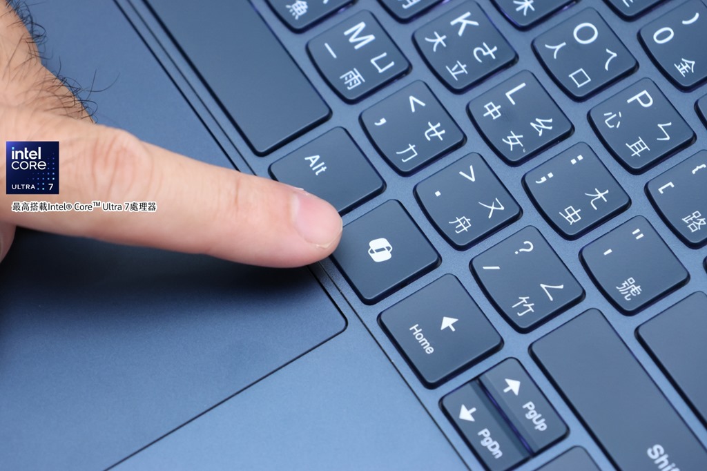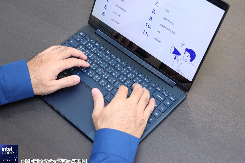 鍵盤則採用無邊際設計,鍵帽採用 0.3mm 凹面設計,打字時可以自然地落在鍵帽中央,輸入起來更有效率,鍵程約 1.5mm,以輕薄筆電來說深度算是滿夠的,在輸入大量資料時手感會比較舒服。