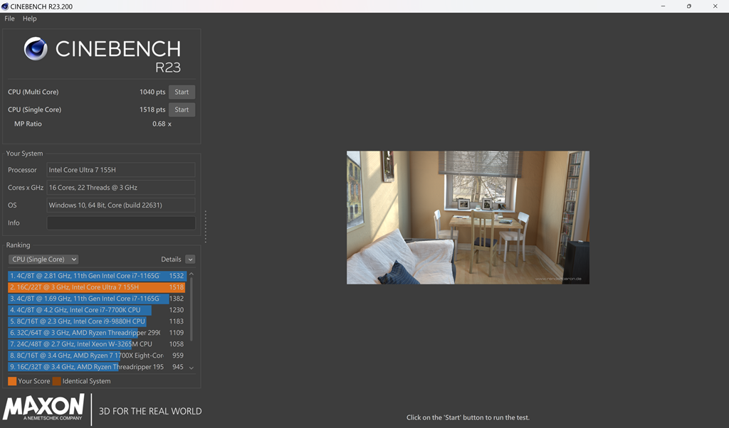 Cinebench R23 測試表現也不錯,單核達到 1518 分、多核達到 1040 分。