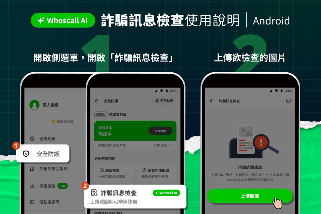 Gogolook 旗下的防詐 App Whoscall 推出全新 AI 功能「詐騙訊息檢查」,提供使用者便利的以圖像辨識詐騙服務。隨著詐騙手法日益複雜,從社群平台的假廣告、冒名訊息到各類釣魚網站,詐騙模式持續創新,利用傳統的方式已難以完全防範。此次 Whoscall 將 AI 技術導入防詐應用中,使用者只需「截圖」或「拍照」,即可將圖片上傳至 Whoscall 進行判讀,以初步辨識詐騙風險。