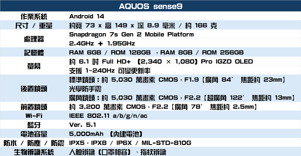 sense9 的電池容量達 5,000mAh,配合 Pro IGZO OLED 螢幕的省電設計,提供高達兩天的續航力。相機方面則搭載 5,030 萬畫素標準鏡頭與超廣角鏡頭,支援從微距至超廣角的拍攝需求,標準鏡頭具備光學防手震,即便在昏暗環境下也能拍出清晰明亮的照片。