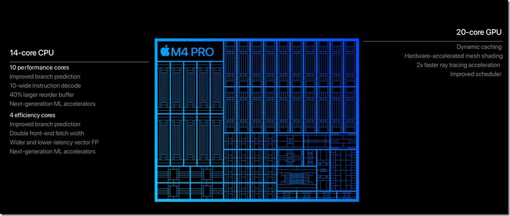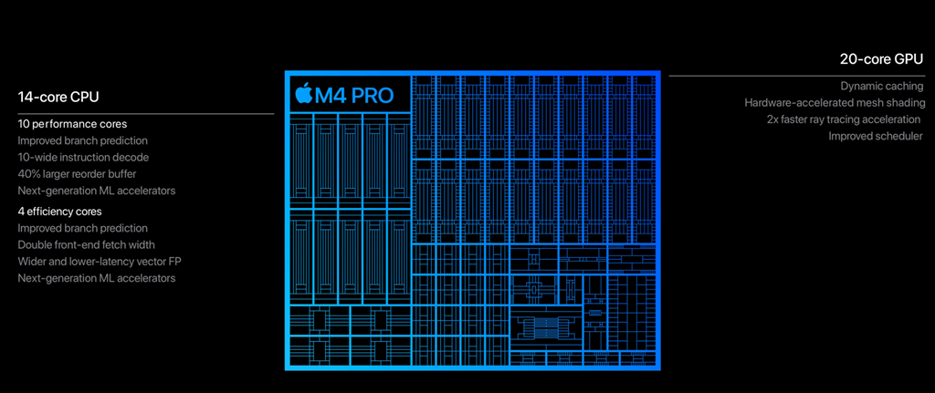 M4 Pro 針對研究人員、工程師和創意專業人士進一步強化。它擁有 14 核心 CPU,最多包含 10 個效能核心,速度比 M1 Pro 快上 1.9 倍,並比最新的 AI PC 晶片快達 2.1 倍。M4 Pro 的 20 核心 GPU 效能同樣比 M4 提升一倍,速度比市面上最新的 AI PC 晶片快達 2.4 倍。這樣的提升使得在 Xcode 中進行應用程式模擬測試更為高效。M4 Pro 支援 64GB 記憶體,頻寬高達每秒 273Gb,比前代快了 75%。M4 Pro 支援 Thunderbolt 5 技術,資料傳輸速率可達每秒 120Gb,對於 AI 訓練、影片處理等大數據需求的專業人士而言,效能表現尤為優異。
