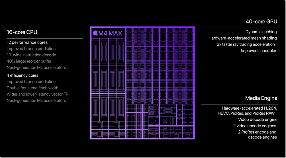 Apple 最新推出的 M4 Pro 和 M4 Max 晶片與 M4 系列一同形成了現今最先進的個人電腦專用晶片組合。這三款晶片使用業界領先的第二代 3 奈米製程技術,不僅大幅提升效能,還增強了能源效率,讓 Mac 裝置在效能與節能表現上更上一層樓。M4 系列的 CPU 擁有當前速度最快的核心,提供業界頂尖的單執行緒效能和顯著提升的多執行緒處理速度。GPU 則在先前的圖形架構基礎上進一步改良,不僅具備更快的核心速度,光線追蹤效能更是前代的 2 倍之多。M4 Pro 和 M4 Max 更是首度將 Thunderbolt 5 技術引入 Mac,同時記憶體頻寬大幅提升,最高可達 75%。