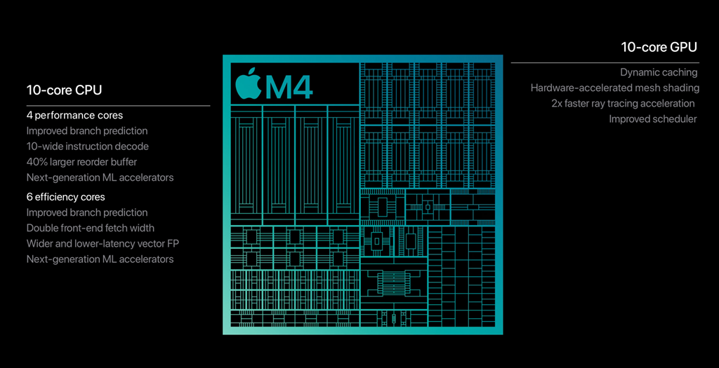 M4 晶片首次為 Mac 帶來了更加出色的性能,適合創業者、學生與創作者等多元使用族群。M4 配備 10 核心 CPU,包含 4 個效能核心和 6 個節能核心,運行速度比 M1 快上 1.8 倍。這讓 Safari 瀏覽、Excel 文書處理等多工任務表現更為出色。M4 的 10 核心 GPU 繪圖效能比 M1 提升 2 倍,無論是照片編輯還是遊戲體驗都更為流暢。M4 支援最高 32GB 統一記憶體,頻寬高達每秒 120Gb,顯示引擎經過強化,支援額外的外接螢幕並包含多達四個 Thunderbolt 4 連接埠,讓周邊設備的連接更靈活。
