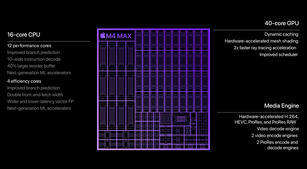 M4 Max 以其強大的運算效能,成為資料科學家、3D 藝術家和作曲家首選。它擁有 16 核心 CPU,包含 12 個效能核心,運行速度比 M1 Max 快達 2.2 倍,並超越最新的 AI PC 晶片 2.5 倍。M4 Max 擁有 40 核心的 GPU,性能比 M1 Max 快上 1.9 倍,比最新 AI PC 晶片更快達 4 倍,使得《DaVinci Resolve Studio》等影片編輯軟體可即時處理繁重的影片格式。M4 Max 支援最高 128GB 統一記憶體,頻寬達每秒 546Gb,方便處理大型語言模型與多參數資料集。此外,M4 Max 的媒體引擎增加了兩個影片編碼引擎和兩個 ProRes 加速器,無論是在影片編輯還是大規模數據運算上皆展現出強大效能。