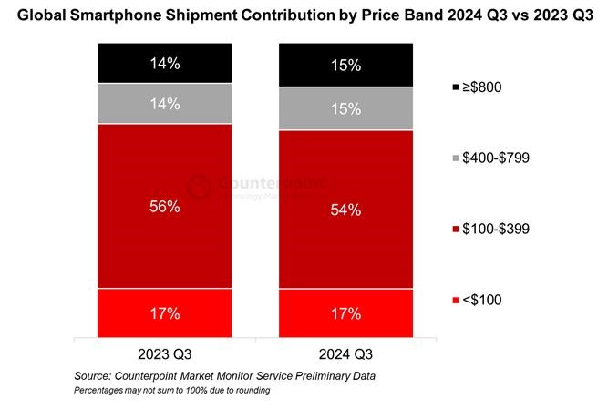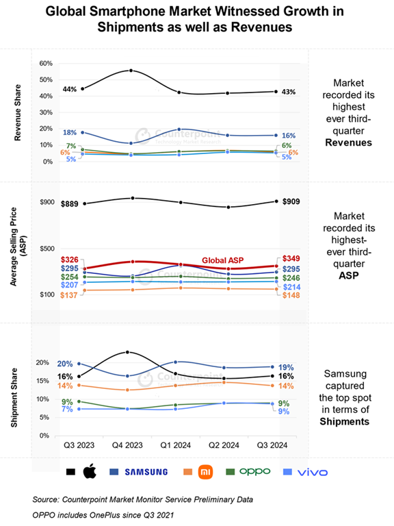 2024 年第三季全球智慧型手機市場成長 2%,總出貨量達到 3.07 億支,並帶動全球智慧型手機營收年增 10%。隨著平均售價 (ASP) 上漲 7%,營收和平均售價雙雙創下第三季歷史新高。