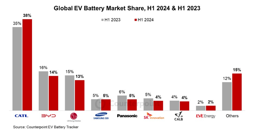 隨著全球電動車市場需求攀升,電池供應市場的競爭日益激烈。根據 Counterpoint Research 2024 年上半年數據顯示,中國電池供應商掌握約 66% 的全球市佔率,穩居市場主導地位。以寧德時代(CATL)為例,其政府補貼在今年上半年增長至 5.47 億美元,使其在生產成本與市場擴展上更具優勢。隨著越來越多車企選擇成本相對較低的磷酸鐵鋰電池(LFP),中國供應商的優勢更形明顯。