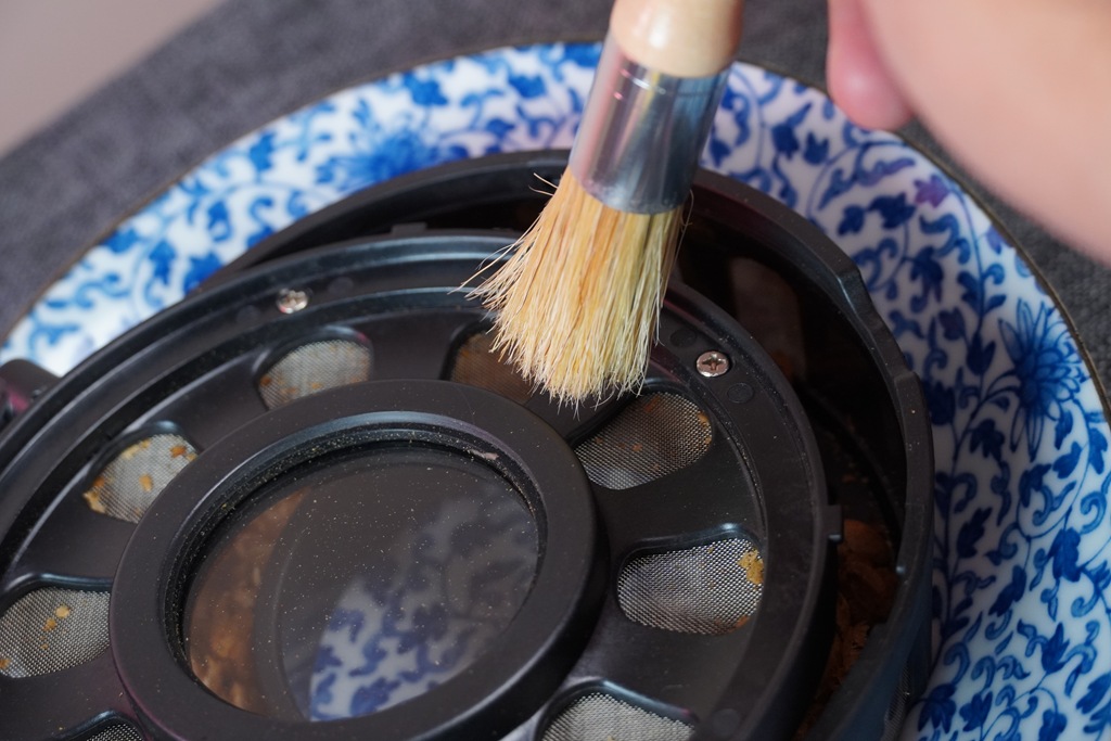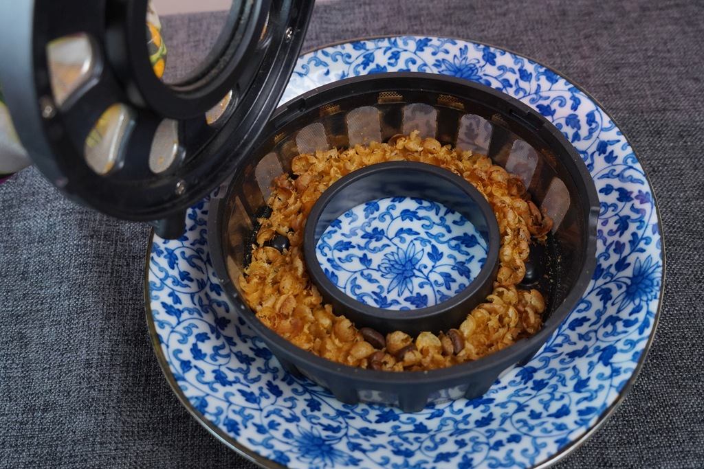 唯一要注意的是,當烘焙完成機身冷卻後,要拿毛刷把濾網上的銀皮清除。另外,大概烘個 10 批次後,建議用洗碗精加水浸泡一下上蓋與銀皮收集盒,溶解掉濾網上的油垢,才能確保透氣性。