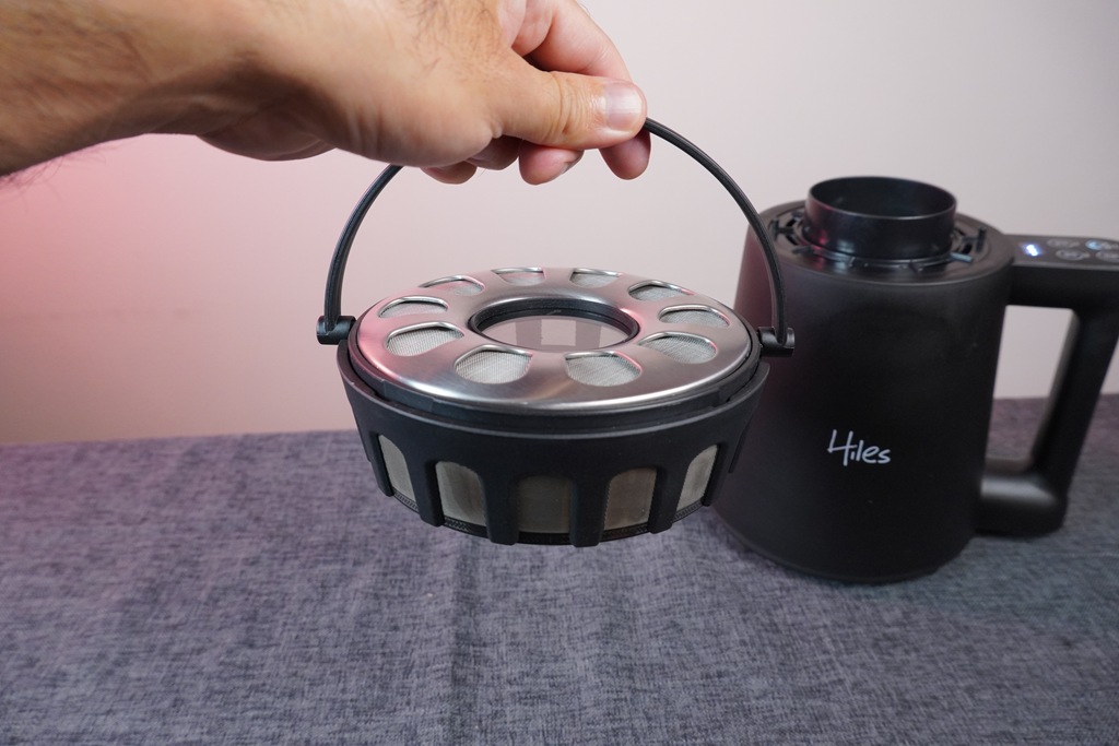 因為這款烘豆機是屬於家用,所以一次烘焙建議在 60~100g 之間,如果是一次烘焙 100g,以一天兩杯 300cc 咖啡來說,大概就可以喝 2~3 天,也就是說烘個兩次就可以喝上一個禮拜。我也有詢問廠商為什麼不把容量做大一點,廠商回答因為要控制售價在入門玩家可以接受的範圍,這樣才能真正讓完全沒接觸過烘豆的朋友,可以無痛入門烘豆這個好玩的領域。Hiles 第二代熱風烘豆機的體積很小,大概就像熱水瓶般大小,很好收納,也更符合家用原則。