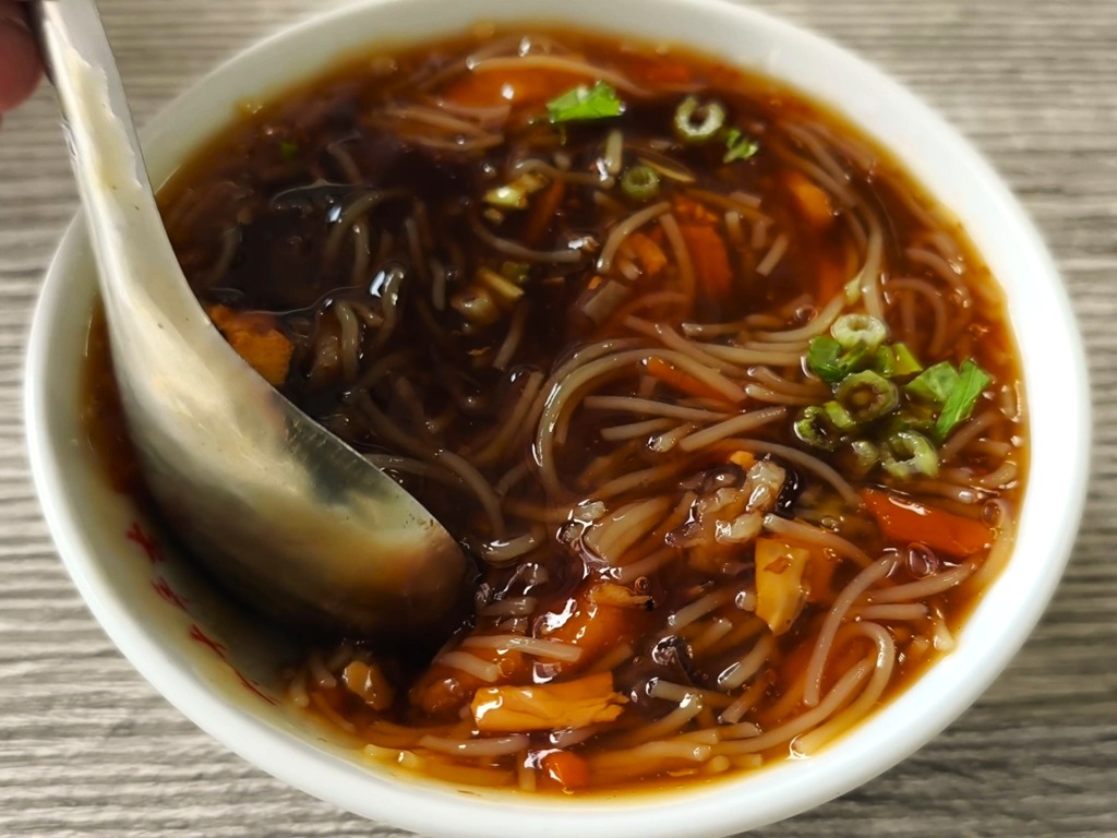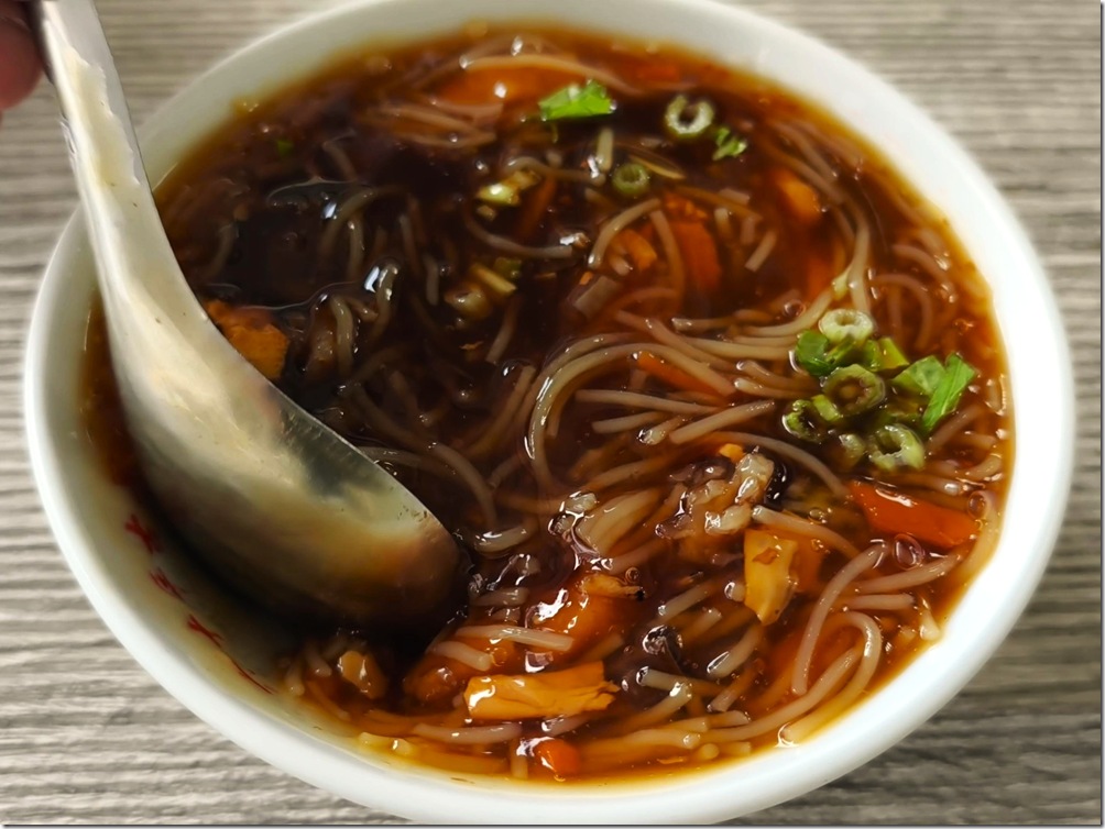 米粉羹是使用口感很好的米粉,加上濃濃帶有魚乾香氣的羹湯,搭配鹹香十足的菜脯,最後淋上黑醋,雖然這味道大家不一定習慣,但既然有來宜蘭,就來試試看吧!