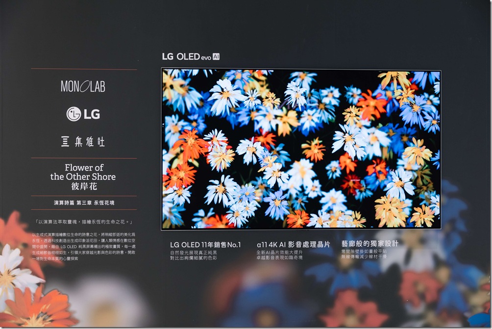 台灣 LG 多年來持續推動創新技術,將高畫質螢幕與藝術相結合,展現出「生活即藝術」的概念。本次展覽與知名數位藝術家吳哲宇合作,透過精密演算法創造「虛擬花海」,花瓣生成、綻放與飄零的過程,象徵生命的脈動與美麗。同時,搭載 Soundbar S95TR 的聲音技術,讓畫面與音效完美結合,增添深度與共鳴,讓藝術不再只是視覺的呈現,更是一場多重感官的體驗。