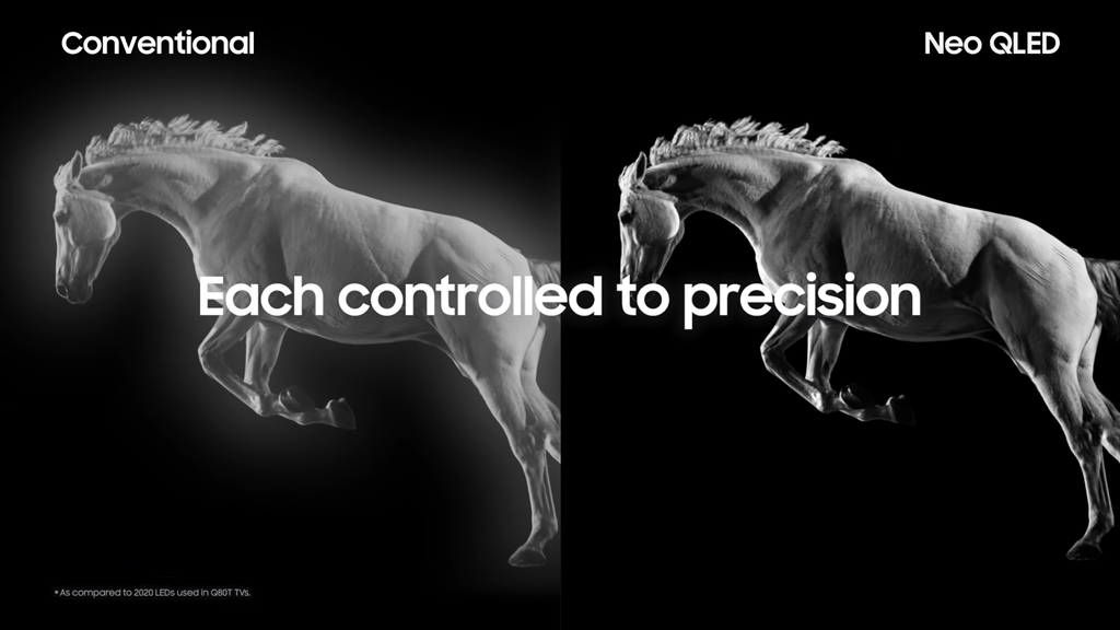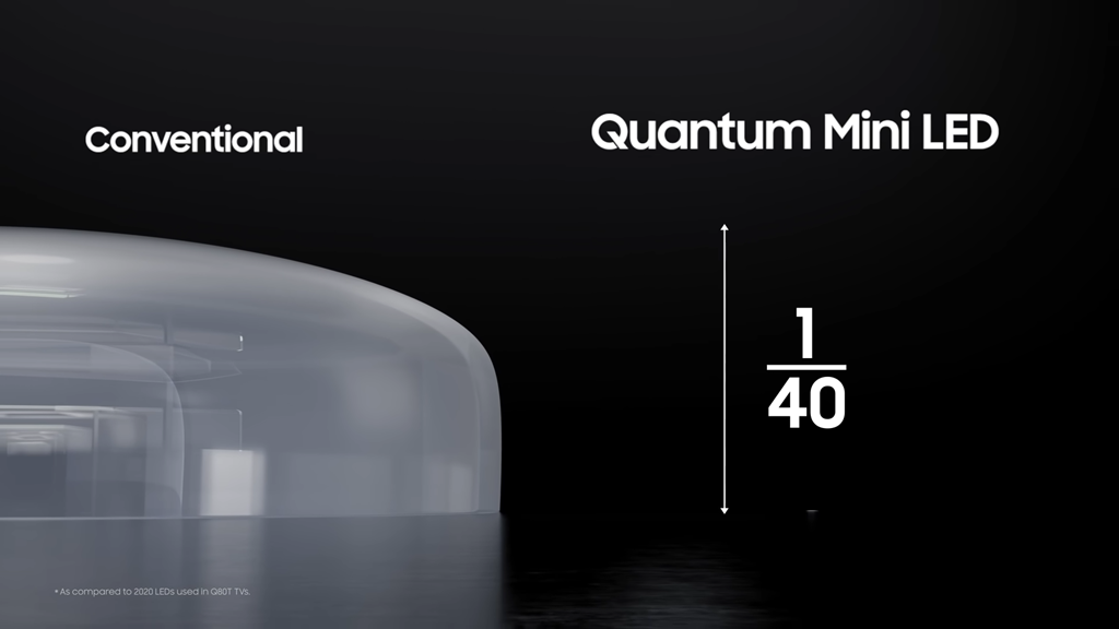 傳統的 LED 需要經過透鏡與均光片,均勻的把光線從側面擴散開來,所以在顯示高對比的畫面時,會有明顯的暈光,亮部與暗部的細節處就會容易變得很朦朧,但 mini LED 改善了這點,直接均勻的分布在面板下方,加上微型塗層可以抑制光線過度發散、集中光線,避免光暈產生,確保黑色的表現更黑,同時讓畫面以均勻的方式顯示,細節處就會更清晰。