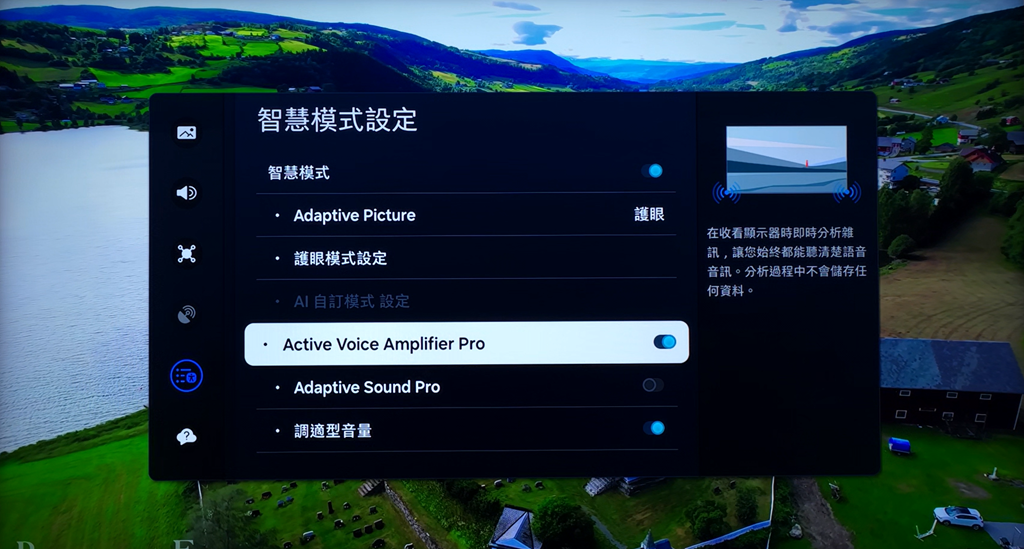 針對聲音三星還有提供幾個貼心的功能,比方說從智慧模式裡打開「智慧抗噪模式 Pro」,智慧顯示器就會分析畫面裡的人物聲音、背景音,還有當下環境的噪音,透過 AI 提高人聲的清晰度,這樣就算身處的環境比較吵,像是家人正在使用吸塵器或是掃地機器人,也能聽清楚電視裡的人在說什麼。