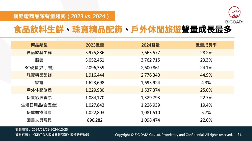 報告最後指出,2024 年電商產業熱點不僅集中於品類表現,更體現在平台間的競爭格局改變。酷澎的快速竄起,momo 購物網的穩定領先,及珠寶配飾、食品飲料生鮮等特定品類的持續熱度,顯示消費者需求在不斷變化。
