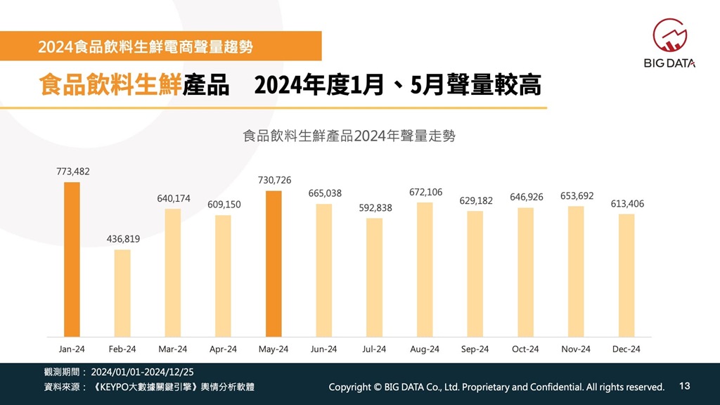 食品飲料生鮮類別2024 年聲量達 766 萬筆,比 2023 年成長 28.2%。其中,1 月份農曆新年及 5 月份母親節檔期討論度最高,海鮮年菜與節慶相關話題佔據了大部分熱度。