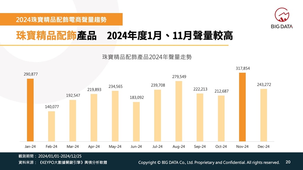 珠寶精品配飾的聲量漲幅達 44.9%,特別是在 1 月新春及 11 月雙 11 電商檔期期間熱度飆升。當月相關商品聲量分別為 31.8 萬筆。珍珠相關設計配件更成為討論焦點,全年聲量接近 23 萬筆,成為節慶送禮的首選之一。