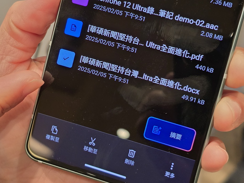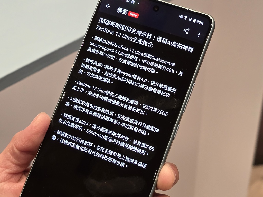 AI 是 ASUS Zenfone 12 Ultra 的重頭戲,之前在 Zenfone 11 Ultra 時,就帶來了錄音筆記、即時通話口譯、搜尋助手…等功能,這次更進化,升級了原有功能外,還加入 AI 文章摘要、AI 檔案摘要…等功能。