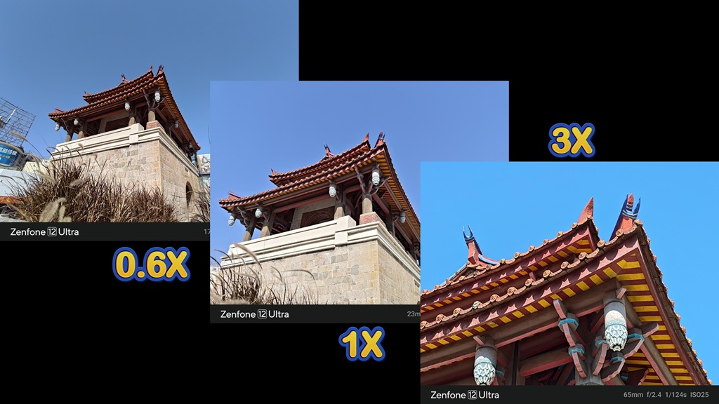 全新的 Zenfone 12 Ultra 在相機規格部分,與上一代 Zenfone 11 Ultra 完全相同,主鏡頭採用 1/1.56” 5000 萬像素 LYT700 感光元件,光圈大小為 F1.9,與前一代的 IMX890 是同一顆感光元件。超廣角鏡頭採用 1300 萬像素感光元件,光圈大小為 F2.2,3 倍光學望遠則為 3200 萬像素感光元件,光圈大小為 F2.4,最大可達 30X 數位變焦。