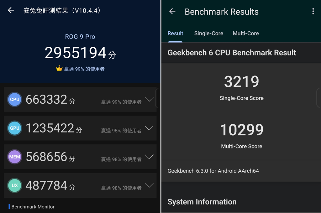 處理器部分,採用全新高通 Snapdragon 8 Elite,搭配 16GB RAM、512GB ROM,以安兔兔跑分可達 295 萬分,Geekbench 6 單核 3219、多核 10299 分。在搭載同樣處理器的機種,這是非常頂尖的成績。不過不知道為什麼安兔兔上面會秀出 ROG 9 Pro?可能是測試時產品還沒上市吧??